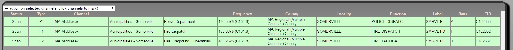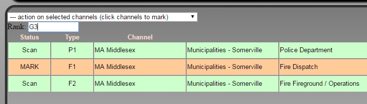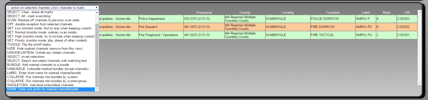 4) For each channel you want to arrange in a sequence, locate the row with channel, and click either the frequency column (preferred), or alternatively the text tag in the third (most specific) level of the system/group/channel hierarchy, to mark that single channel. (Clicking in other columns will instead mark groups of related channels.)