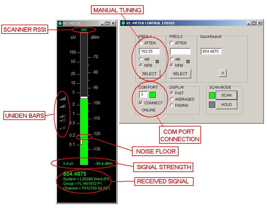 A Rangecast utility software. Displays a calibrated signal strength bar for checking signal levels and background RF noise. The signal bar facilitates aiming directional antennas (also audio chirp speeds up and increases pitch as signal level increases, to help antenna aiming without needing to look at screen.) Also has a P25 signal quality bar which appears during P25 transmissions. Allows directly entering frequencies to tune scanner and select attenuation.