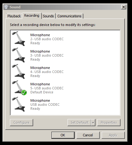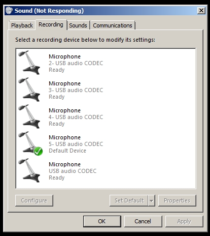 3) If this problem is occurring, there will be no audio level meters on the right side of the Sound panel (such meters are usually present for every input when on the Recording tab)