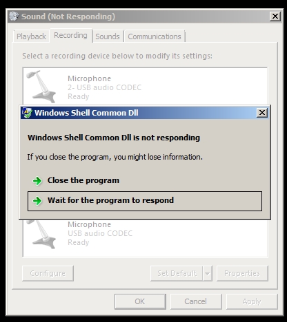 To do this, it may be possible to isolate the card causing the trouble by disabling them all in Device Manager, then opening the RECORD tab in the Sound panel. One by one, enable the cards and try opening the Sound panel. When the bad card is enabled, then the Sound panel will probably freeze. Removing or replacing that card may prevent the problem.
