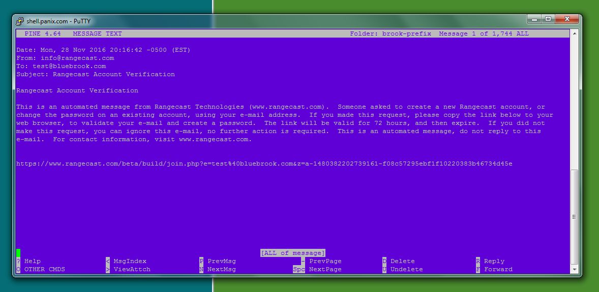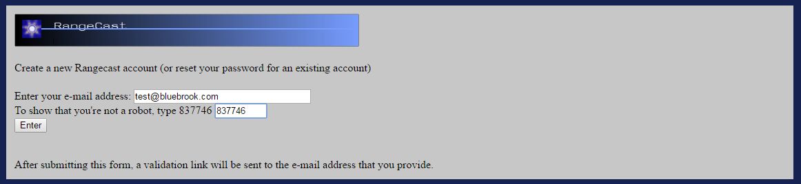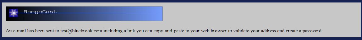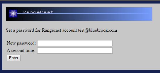 A Rangecast user account is created, or a password reset, by the exact same process: affirmatively setting a password for the account. For user accounts identical to an e-mail address, this is done via a verification link sent by Rangecast to the user (on request via the Rangecast website). For user accounts in a 'user@hubname' format, this is done by an administrator for the hub.