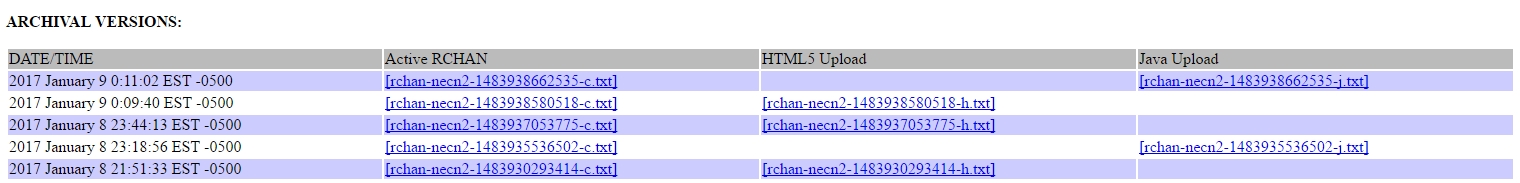 Both the current and all prior versions of these elements (HTML5 and supplementary RCHANs) and the composite (the active RCHAN built from combining the most recent of each of these elements) are available on the status page, Programming tab. Each time either source file is updated, a row is added showing the time, the new file (in the appropriate column - "HTML5 upload" for the HTML5 file, "Java upload" for the supplementary file) and the new composite file ("Active RCHAN" column).