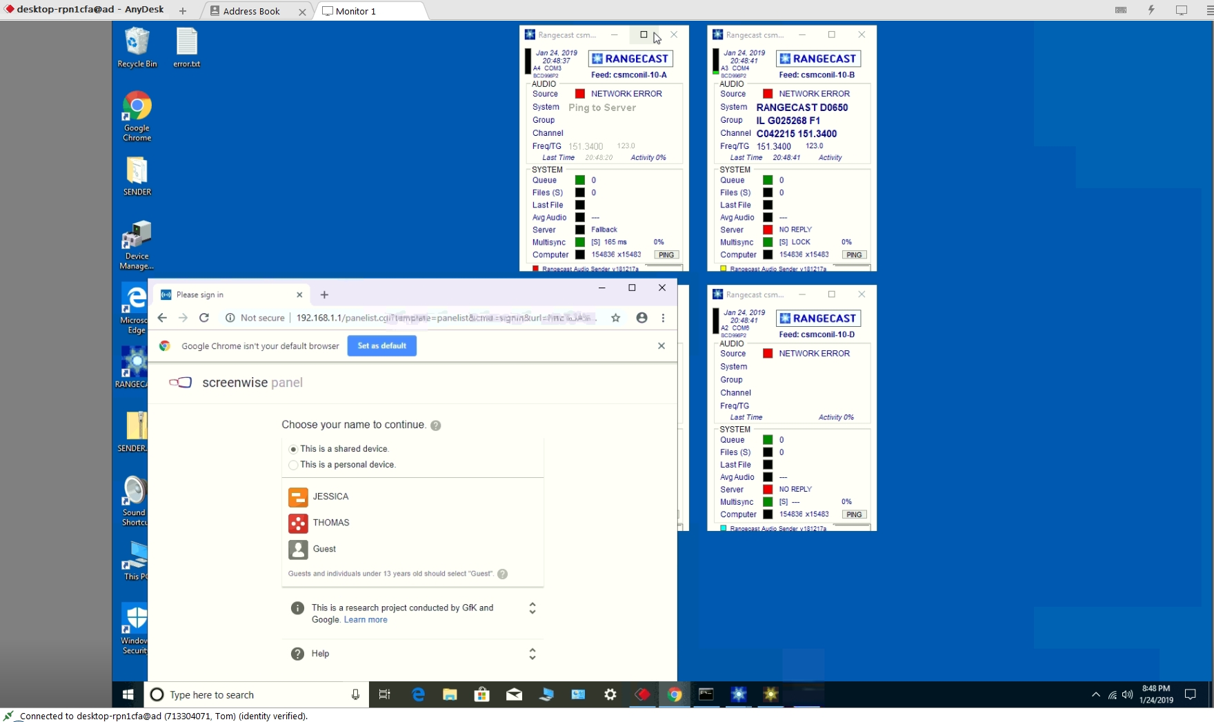 Screenwise Panel should be removed from the PC and LAN, so it is not sitting between the Rangecast software and server. Any software that blocks internet access until someone manually presses a button is inappropriate in the context of automated systems such as a Rangecast feed site.