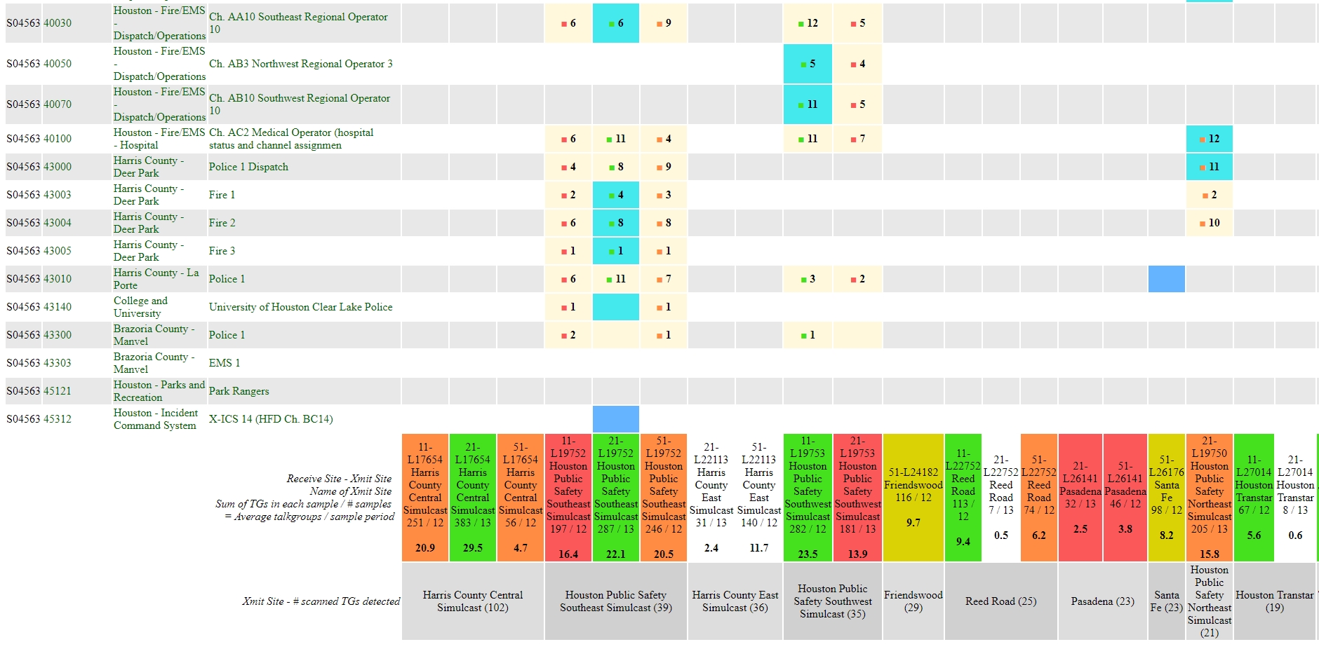 If a cell is blank (no number shown), this means the talkgroup was not detected from that receiver/tower combination during the period of the survey.