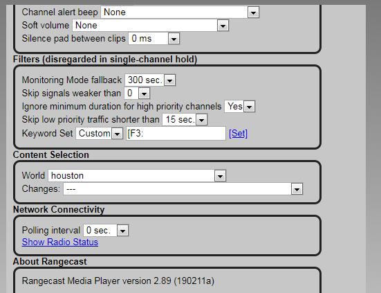 METHODYou can check the status of the radios providing audio, with a special report inside the player. In the top menu bar of the Rangecast player, select the gear icon also known as "Preferences/Options" and scroll down to the Network Connectivity Section and click on the "Show Radio Status" link.